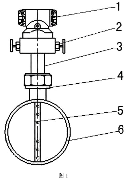 本實(shí)用新型包括差壓變送器1、三通閥2、取壓件3、鎖緊螺母4、傳感器5、管道6,管道6的上部設(shè)有開(kāi)口,傳感器5的一端垂直插入管道6的內(nèi)部,傳感器5的另一端連接取壓件3,所述的取壓件3通過(guò)鎖緊螺母4固定在管道6的上部開(kāi)口處,取壓件3連接三通閥2,三通閥2的端部連接差壓變送器1,所述的傳感器5包括本體5.1,本體5.1呈錐形結(jié)構(gòu),本體5.1的前端部為圓弧形錐頭5.2,本體5.1的末端部為圓弧形錐尾5.3,本體5.1的前端的圓弧形錐頭5.2為迎流方向端,所述的圓弧形錐頭5.2上設(shè)有取壓孔5.5,本體5.1的兩側(cè)設(shè)有取壓孔5.5。
