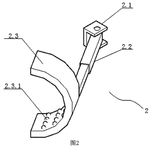 如圖2所示,所述定位裝置2包括U型連接組件2.1、可轉(zhuǎn)動伸縮桿2.2、夾持弧形件2.3,所述U型連接組件2.1固定在所述測量導(dǎo)管1.2上,所述可轉(zhuǎn)動伸縮桿2.2為長方形伸縮桿,所述可轉(zhuǎn)動伸縮桿2.2的右端部位通過銷軸與所述U型連接組件2.1鉸接,所述夾持弧形件2.3固定在所述可轉(zhuǎn)動伸縮桿2.2的左端面,所述夾持弧形件2.3上設(shè)有滾珠2.3.1,若干個所述滾珠2.3.1位于所述夾持弧形件2.3的內(nèi)側(cè)表面上,所述滾珠2.3.1可相對所述夾持弧形件2.3滾動。