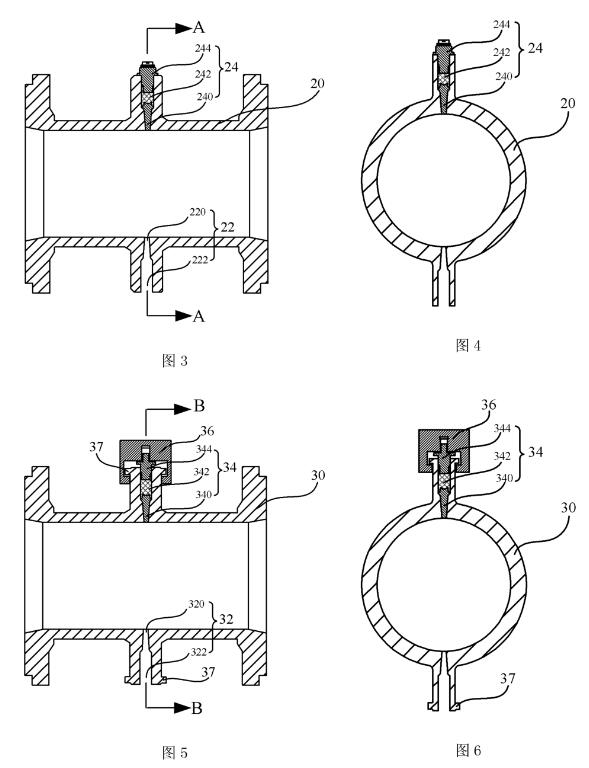 特別地,在本實用新型的電磁流量計傳感器中,對向配置在陶瓷測量管20相對兩端的一對電極插孔22外凸于所述陶瓷測量管呈凸臺狀。相對于電極插孔的深度與陶瓷測量管的管壁厚度相當(相近或相等)的現有技術,本實施例中的電極插孔22的深度要遠大于(2倍以上)陶瓷測量管20的管壁厚度。具體地,電極插孔22為內縮外擴的沉孔結構,包括指向陶瓷測量管20內壁面的**插孔區段220以及與**插孔區段220相連、指向陶瓷測量管20外壁面的第二插孔區段222。其中,**插孔區段220中遠離第二插孔區段222的那一個端面是與陶瓷測量管20內壁面相齊平。**插孔區段220呈圓柱狀或圓錐狀(呈內窄外寬);第二插孔區段222呈圓柱形或圓錐形(呈內窄外寬);第二插孔區段222和第插孔區段220的連接面呈平面或圓錐面,較佳地,呈圓錐面。針對電極插孔22的制作,在一個實施例中,可以是在陶瓷測量管20的燒結工藝前預留有與電極插孔22對應的結構從而在燒結工藝后形成,例如采用了與待形成的電極插孔對應的模具并在燒結工藝后去除所述模具從而形成電極插孔22:或者,在另一實施例