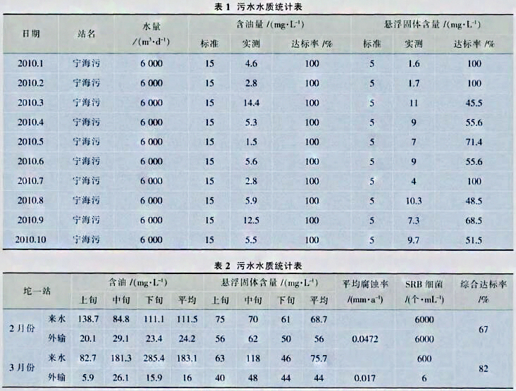 以一礦為例,2010年1~10月寧海污水站累計處理污水187萬m3,日均6200m3,1~10月份外輸污水含油累計達(dá)標(biāo)率1 0 0%,外輸懸浮物累計達(dá)標(biāo)率69.7%(見表1)。