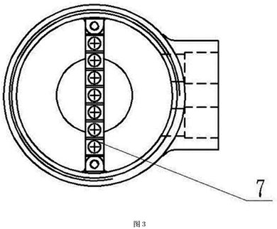 本實施例如圖4所示,分體接線盒用4只M6的螺釘8將殼體3與固定在流量傳感器7上端,殼體3與傳感器7之間采用橡膠密封墊9密封。端子排7用兩個M4的螺釘固定在殼體內,接線端子通過連接電纜5,穿過安裝在殼體上的格蘭頭6連接到變送器。分體蓋l通過螺紋擰緊在殼體3的上端,分體蓋1與殼體3的密封采用O型圈密封。使用時電纜與管道軸線方向一致,管道為垂直方向時,電纜出線方向朝下,從而不會造成外部的液體流