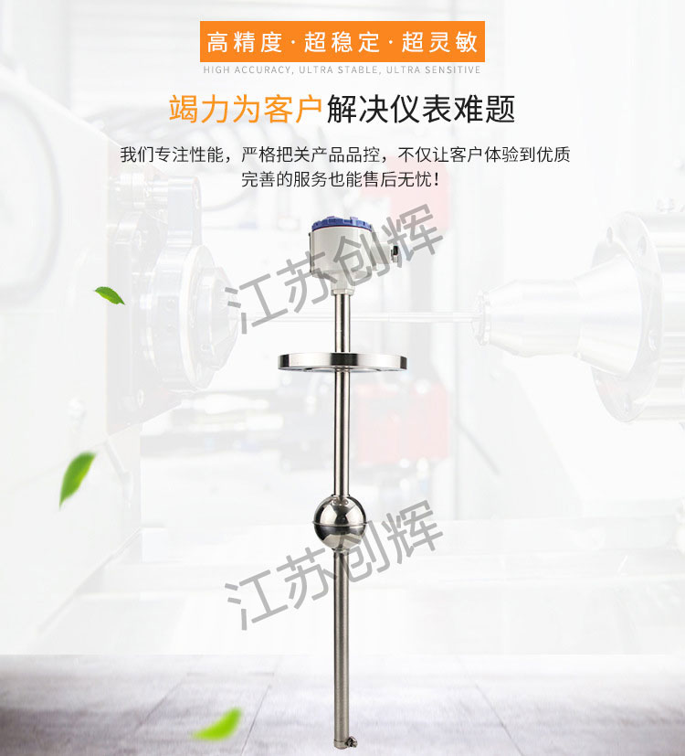 CH-UQZ磁性浮球液位計由磁浮球、傳感器、變送器三部分組成。當磁浮球隨液位變化,沿導管而上下浮動,浮球內的磁鋼吸合傳感器內相應位置上的干簧管,使傳感器的總電阻(或電壓)發生變化,再由變送器將變化后的電阻(或電壓)信號轉換成4~20mA的電流信號輸出。并可在顯示儀上設定上、下限報警,實現對液位的位式控制。