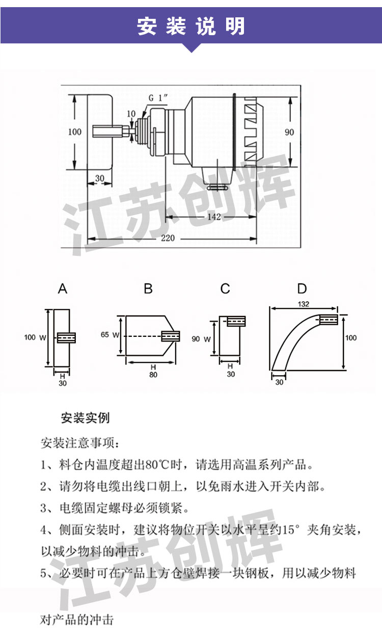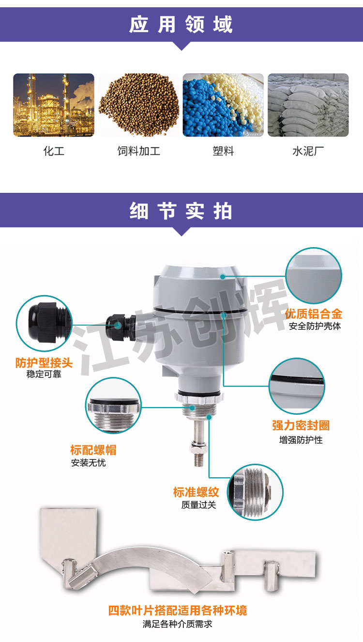 CH-ZX系列阻旋料位開關是一種用于固態物料(包括粉狀、粒狀、塊狀、膠狀等)的物位控制器。阻旋料位開關具有密封性好、過載能力強(具有過載保護)、輕便易裝、輸出觸點容量大等特點。針對不同比重的物料可通過調整彈簧的拉力來實現,其接觸物料部分全為不銹鋼材料。阻旋式料位開關在化工、塑料、水泥、制藥、飼料、食品等行業得到了**的應用。江蘇創輝儀表是**的阻旋料位開關廠家,價格咨詢電話15358667860。