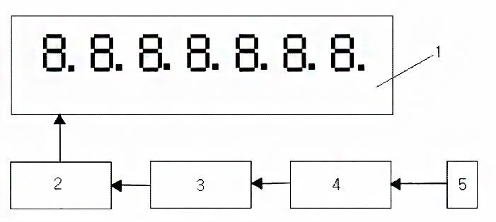如圖1所示,本實(shí)用新型實(shí)施例所提供的一種用于電磁流量計(jì)的遠(yuǎn)距離流量顯示裝置,包括LED數(shù)碼管1和LED驅(qū)動(dòng)芯片2,其特征在于:還包括單片機(jī)3、RS485通信芯片4和RS485通信連接件5
